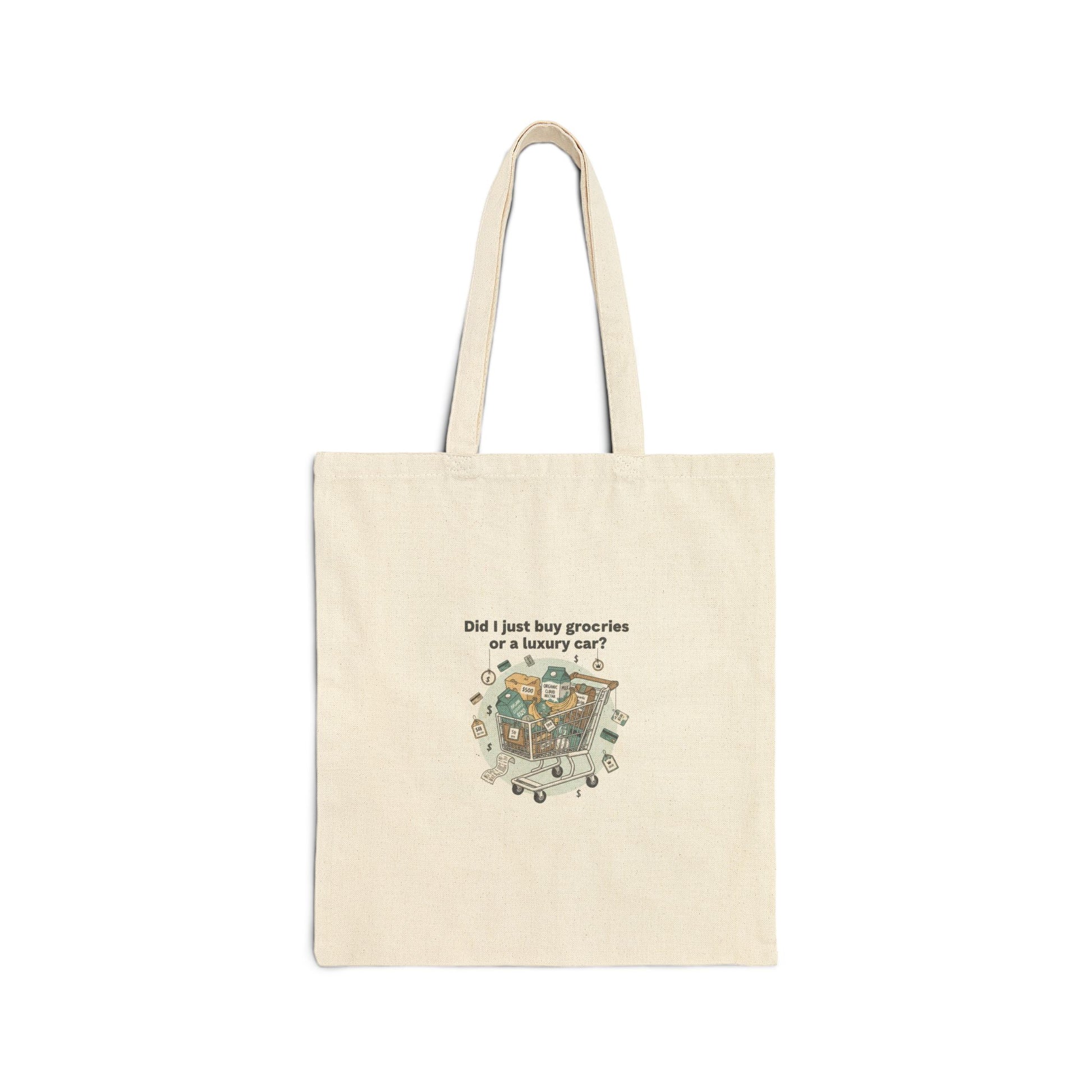 Dry, meme-ready canvas tote that turns grocery sticker shock into a sideways laugh. The design pairs a simple grocery-cart illustration with a concise price-joke headline in high-contrast, readable type — a visual punchline that fits the Food/Groceries Price-Meme trend. Lightweight to carry yet heavy-duty in construction, this tote works as a day-to-day market bag and a cheeky conversation starter for budget-conscious shoppers and meme fans.