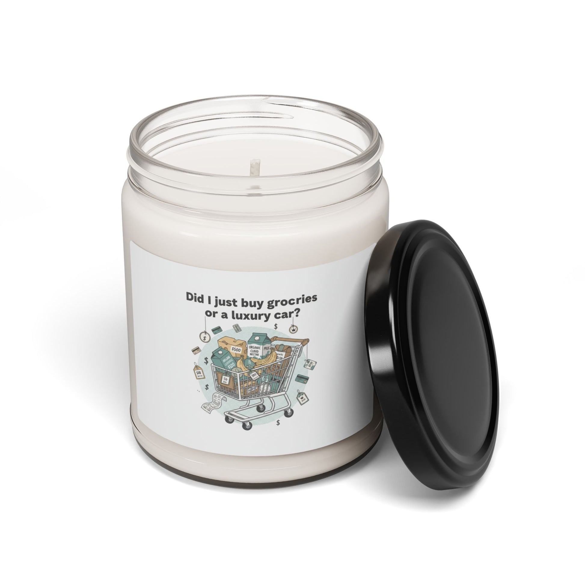 Dry, meme-ready candle that turns grocery inflation into a wry one-liner. The label shows a packed shopping cart illustrated with small price tags and flying bills, paired with the cheeky line about groceries vs. a luxury car — a simple, contrast-forward design that fits the Food/Groceries Price-Meme trend. Lightweight, readable type and muted pantry colors make this a low-key conversation piece for kitchen counters, desks, or shared apartments, giving budget-conscious shoppers a way to vent with humor while enjoying a long-burning scented candle.