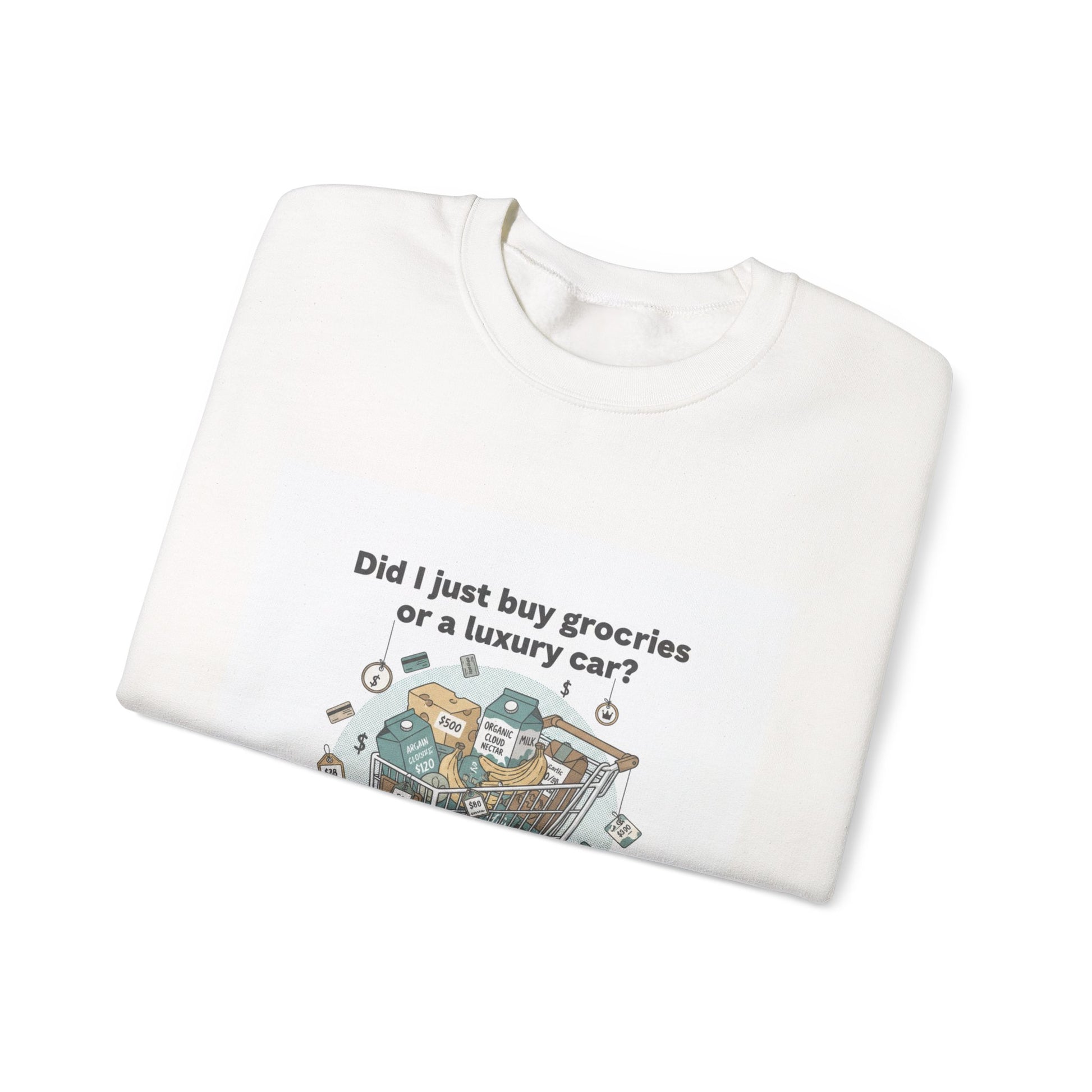Dry, meme-driven art of an overstuffed grocery cart with tiny price tags floating around and the cheeky line “Did I just buy groceries or a luxury car?”—a conversational piece that taps into grocery-price humor and budget-meme culture. The illustration’s high-contrast, readable lettering and compact center-chest placement make the quip instantly sharable while the soft, midweight crewneck keeps the tone casual and wearable for everyday errands or lounging. This sweatshirt fits into the Food/Groceries Price-Meme trend by turning inflation frustration into a witty, relatable statement piece that sparks knowing smiles and online shares.